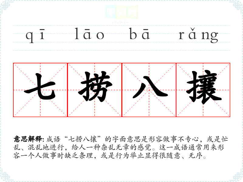 成语“七捞八攘”的字面意思是形容做事不专心,或是忙乱、混乱地进行,给人一种杂乱无章的感觉。这一成语通常用来形容一个人做事时缺乏条理,或是行为举止显得很随意、无序。