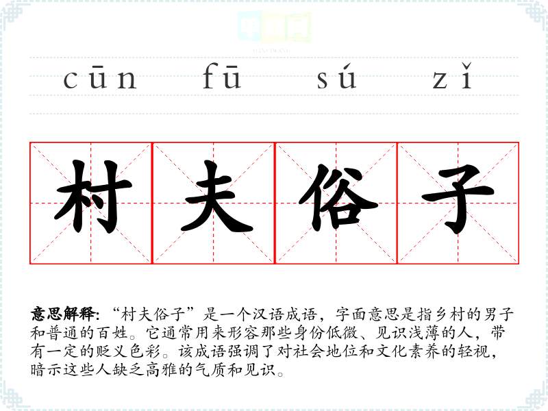 在**传统文化中,士农工商的社会结构使得“村夫俗子”这一成语在历史上具有深刻的社会背景。村夫和俗子代表了普通百姓的地位,反映了社会对不同阶层的看法。在现代社会,虽然阶层流动性增加,但这一成语依然可以用来讨论教育与文化的重要性,提醒人们要不断提升自我。