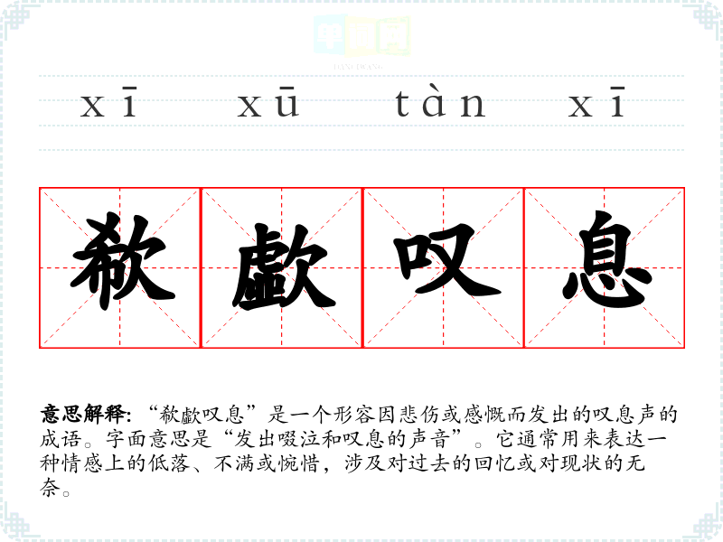 “欷歔叹息”是一个形容因悲伤或感慨而发出的叹息声的成语。字面意思是“发出啜泣和叹息的声音”。它通常用来表达一种情感上的低落、不满或惋惜,涉及对过去的回忆或对现状的无奈。