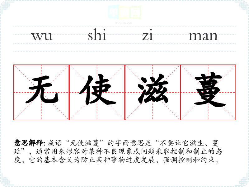 成语“无使滋蔓”的字面意思是“不要让它滋生、蔓延”,通常用来形容对某种不良现象或问题采取控制和制止的态度。它的基本含义为防止某种事物过度发展,强调控制和约束。