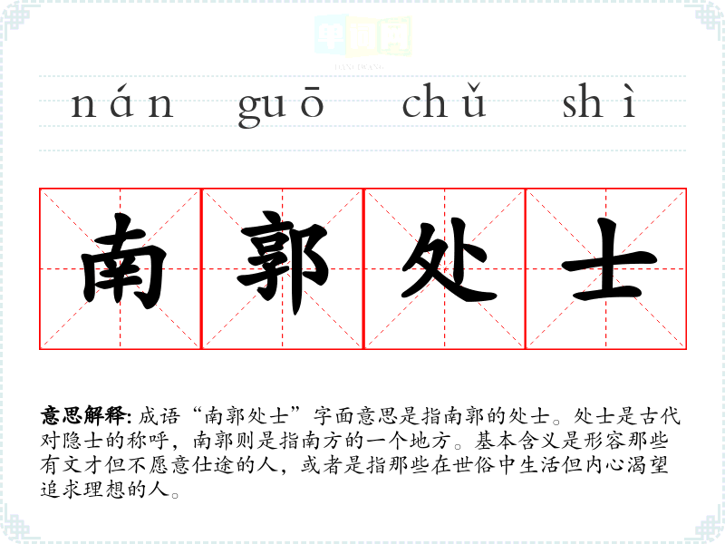 成语“南郭处士”字面意思是指南郭的处士。处士是古代对隐士的称呼,南郭则是指南方的一个地方。基本含义是形容那些有文才但不愿意仕途的人,或者是指那些在世俗中生活但内心渴望追求理想的人。
