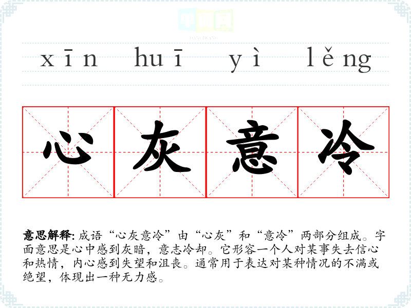 成语“心灰意冷”由“心灰”和“意冷”两部分组成。字面意思是心中感到灰暗,意志冷却。它形容一个人对某事失去信心和热情,内心感到失望和沮丧。通常用于表达对某种情况的不满或绝望,体现出一种无力感。