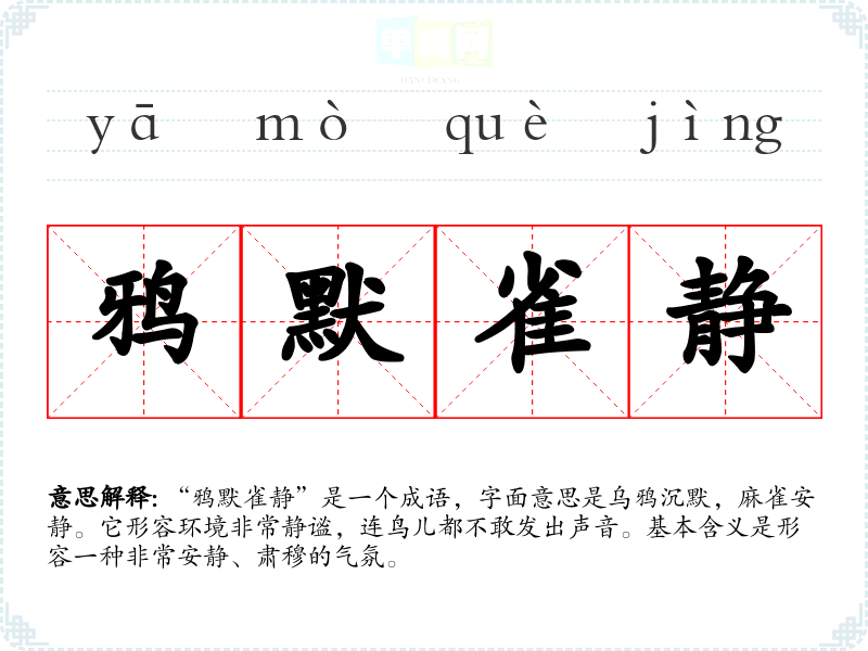 | 鸦默雀静 | 连乌鸦麻雀的声音都没有。形容没有一点声息。 |