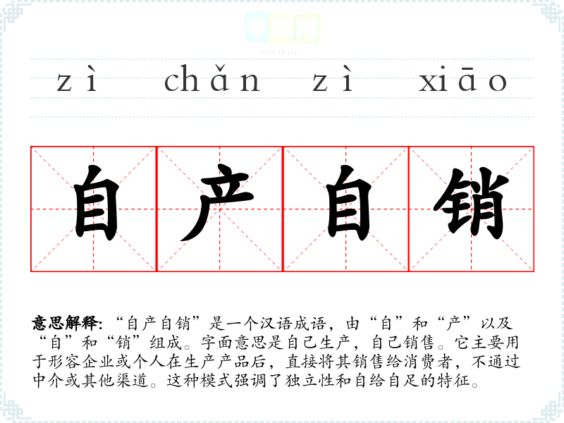 “自产自销”是一个汉语成语,由“自”和“产”以及“自”和“销”组成。字面意思是自己生产,自己销售。它主要用于形容企业或个人在生产产品后,直接将其销售给消费者,不通过中介或其他渠道。这种模式强调了独立性和自给自足的特征。