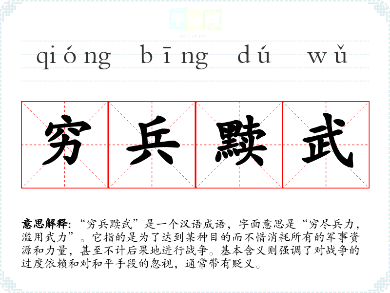“穷兵黩武”是一个汉语成语,字面意思是“穷尽兵力,滥用武力”。它指的是为了达到某种目的而不惜消耗所有的军事资源和力量,甚至不计后果地进行战争。基本含义则强调了对战争的过度依赖和对和平手段的忽视,通常带有贬义。