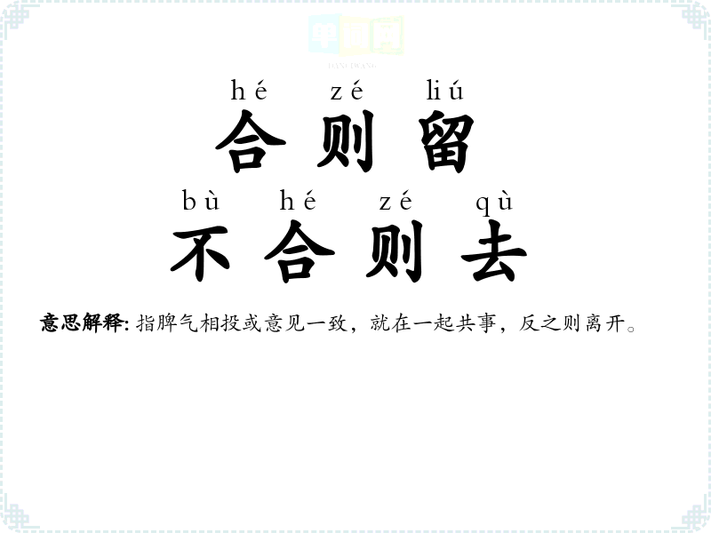 | 合则留,不合则去 | 指脾气相投或意见一致,就在一起共事,反之则离开。 |