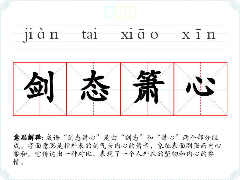 成语“剑态箫心”是由“剑态”和“箫心”两个部分组成。字面意思是指外表的剑气与内心的箫音,象征表面刚强而内心柔和。它传达出一种对比,表现了一个人外在的坚韧和内心的柔情。