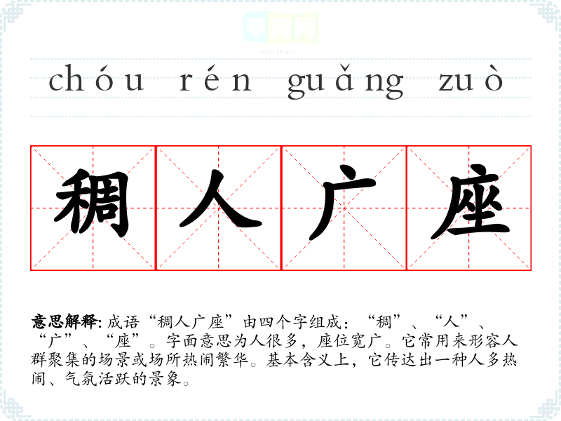 成语“稠人广座”由四个字组成:“稠”、“人”、“广”、“座”。字面意思为人很多,座位宽广。它常用来形容人群聚集的场景或场所热闹繁华。基本含义上,它传达出一种人多热闹、气氛活跃的景象。