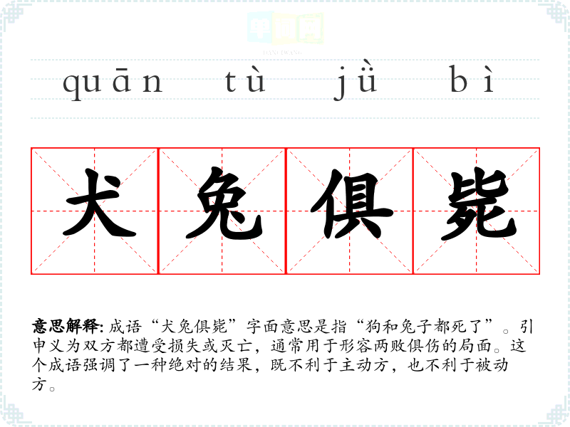 成语“犬兔俱毙”字面意思是指“狗和兔子都死了”。引申义为双方都遭受损失或灭亡,通常用于形容两败俱伤的局面。这个成语强调了一种绝对的结果,既不利于主动方,也不利于被动方。