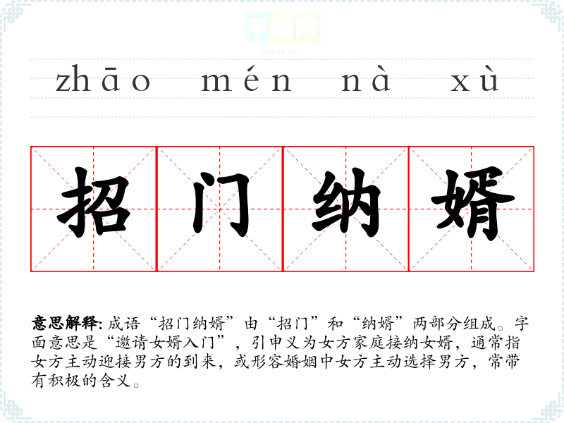成语“招门纳婿”由“招门”和“纳婿”两部分组成。字面意思是“邀请女婿入门”,引申义为女方家庭接纳女婿,通常指女方主动迎接男方的到来,或形容婚姻中女方主动选择男方,常带有积极的含义。
