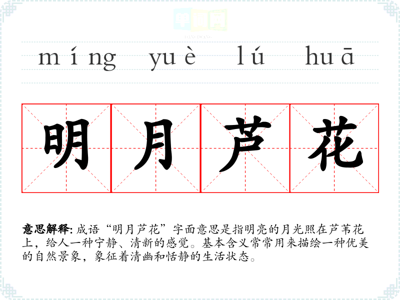 “明月芦花”并不是一个历史悠久的成语,而是出现在一些现代文学作品中,常用以描绘自然之美。它的具体出处较少,但可以联想到中国古代诗词中常描写月光与水边植物的意象,如李白、杜甫等诗人都曾用月光和花草描绘自然景色。