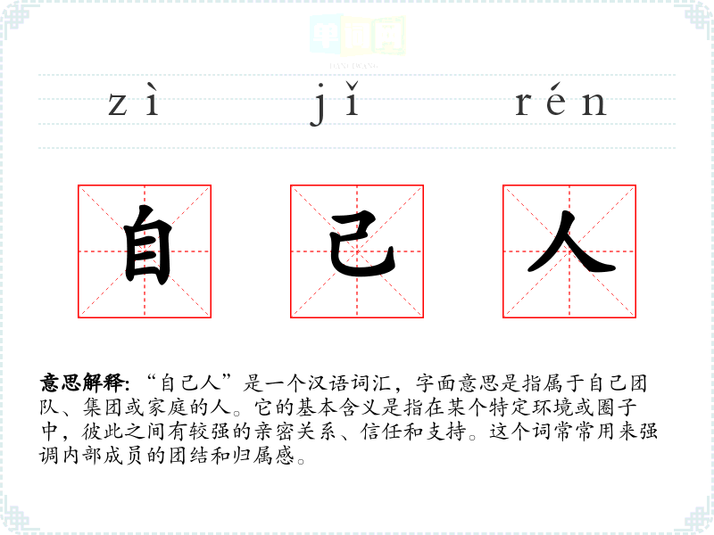 “自己人”是一个汉语词汇,字面意思是指属于自己团队、集团或家庭的人。它的基本含义是指在某个特定环境或圈子中,彼此之间有较强的亲密关系、信任和支持。这个词常常用来强调内部成员的团结和归属感。