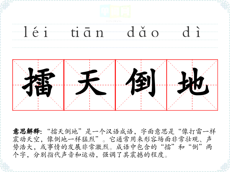 “擂天倒地”是一个汉语成语,字面意思是“像打雷一样震动天空,像倒地一样猛烈”。它通常用来形容场面非常壮观、声势浩大,或事情的发展非常激烈。成语中包含的“擂”和“倒”两个字,分别指代声音和**,强调了其震撼的程度。