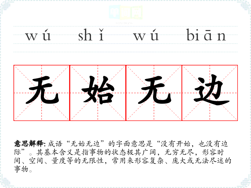 成语“无始无边”源自古代哲学,尤其是道教和思想,反映了对宇宙和时间的理解。在中,常提到“无始无终”,强调轮回和因果法则,体现出时间的循环与无尽。尽管没有明确的文学出处,但与这些哲学思想密切相关,使其成为一种形而上学的表达。