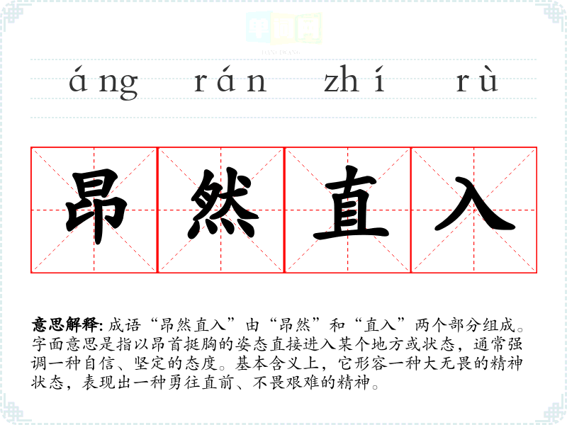成语“昂然直入”由“昂然”和“直入”两个部分组成。字面意思是指以昂首挺胸的姿态直接进入某个地方或状态,通常强调一种自信、坚定的态度。基本含义上,它形容一种大无畏的精神状态,表现出一种勇往直前、不畏艰难的精神。