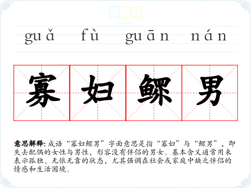 成语“寡妇鳏男”字面意思是指“寡妇”与“鳏男”,即失去配偶的女性与男性,形容没有伴侣的男女。基本含义通常用来表示孤独、无依无靠的状态,尤其强调在社会或家庭中缺乏伴侣的情感和生活困境。