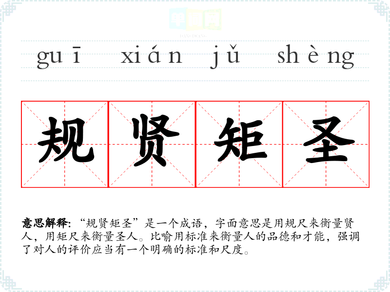“规贤矩圣”是一个成语,字面意思是用规尺来衡量贤人,用矩尺来衡量圣人。比喻用标准来衡量人的品德和才能,强调了对人的评价应当有一个明确的标准和尺度。