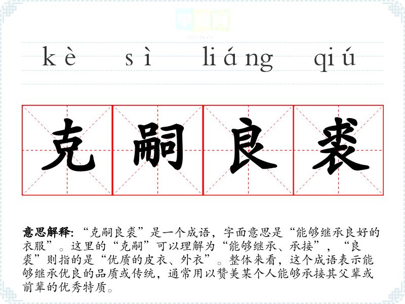 “克嗣良裘”是一个成语,字面意思是“能够继承良好的衣服”。这里的“克嗣”可以理解为“能够继承、承接”,“良裘”则指的是“优质的皮衣、外衣”。整体来看,这个成语表示能够继承优良的品质或传统,通常用以赞美某个人能够承接其父辈或前辈的优秀特质。