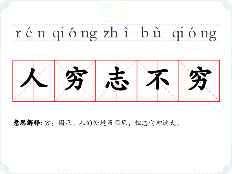 | 人穷志不穷 | 穷:困厄。人的处境虽困厄,但志向却远大。 |