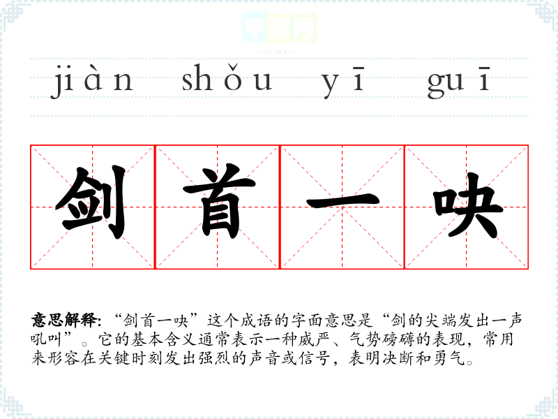 “剑首一吷”这个成语的字面意思是“剑的尖端发出一声吼叫”。它的基本含义通常表示一种威严、气势磅礴的表现,常用来形容在关键时刻发出强烈的声音或信号,表明决断和勇气。