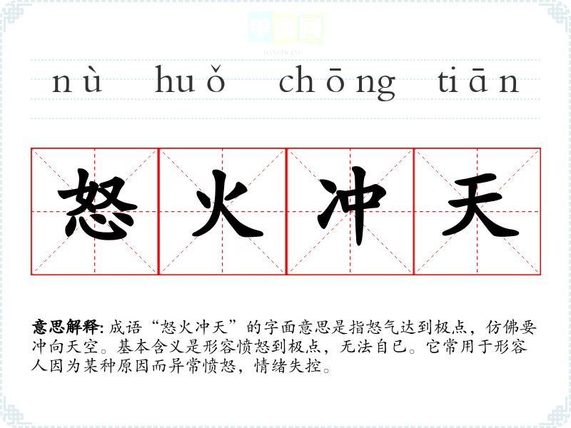 “怒火冲天”出自古代文学,特别是在古代诗词和文学作品中常有描述愤怒情绪的场景。虽然没有明确的单一出处,但可以认为是对“怒火”的形象化表达,反映了古人对情绪的直观感受。这一成语的构成也体现了古汉语的形象化特征。