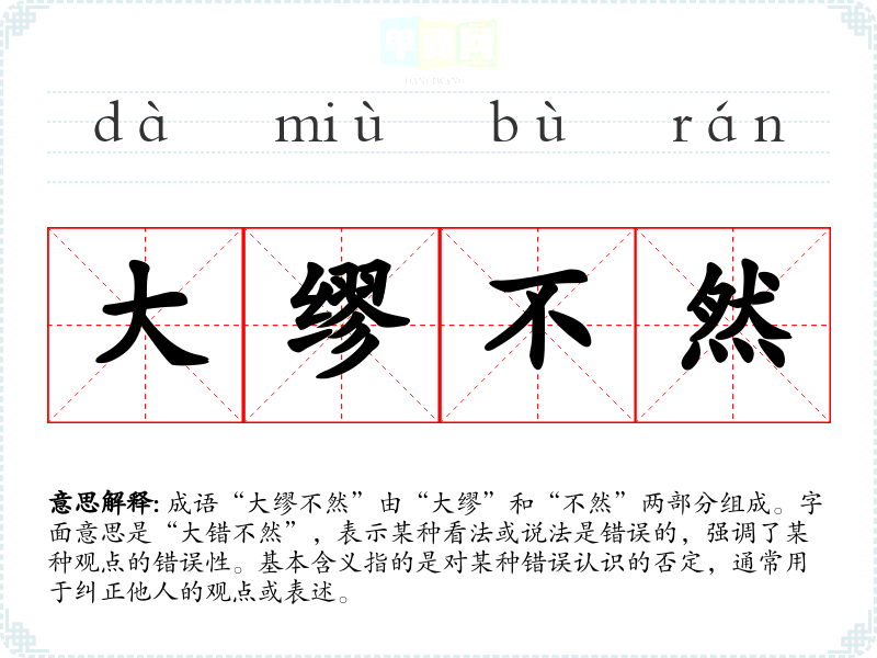 成语“大缪不然”由“大缪”和“不然”两部分组成。字面意思是“大错不然”,表示某种看法或说法是错误的,强调了某种观点的错误性。基本含义指的是对某种错误认识的否定,通常用于纠正他人的观点或表述。