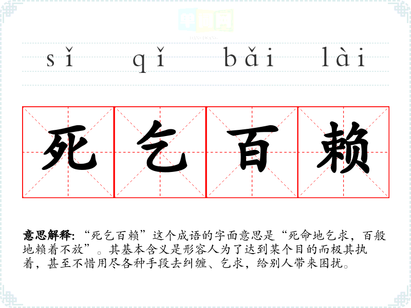 “死乞百赖”这个成语的字面意思是“死命地乞求,百般地赖着不放”。其基本含义是形容人为了达到某个目的而极其执着,甚至不惜用尽各种手段去纠缠、乞求,给别人带来困扰。
