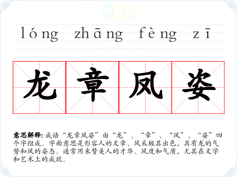 成语“龙章凤姿”由“龙”、“章”、“凤”、“姿”四个字组成。字面意思是形容人的文章、风采极其出色,具有龙的气势和凤的姿态。通常用来赞美人的才华、风度和气质,尤其在文学和艺术上的成就。