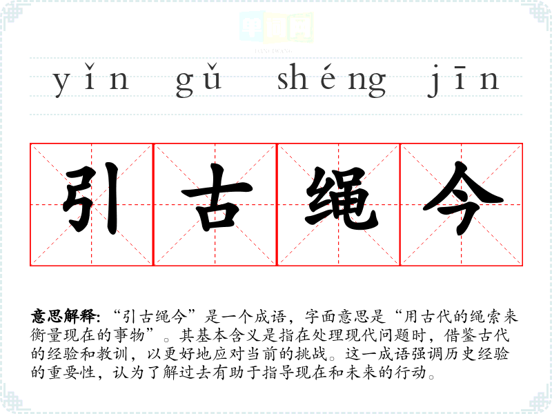 | 引古绳今 | 援引古代的准则来衡量、匡正今天的事物。 |