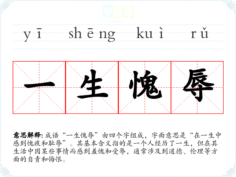 成语“一生愧辱”由四个字组成,字面意思是“在一生中感到愧疚和耻辱”。其基本含义指的是一个人经历了一生,但在其生活中因某些事情而感到羞愧和受辱,通常涉及到道德、伦理等方面的自责和悔恨。