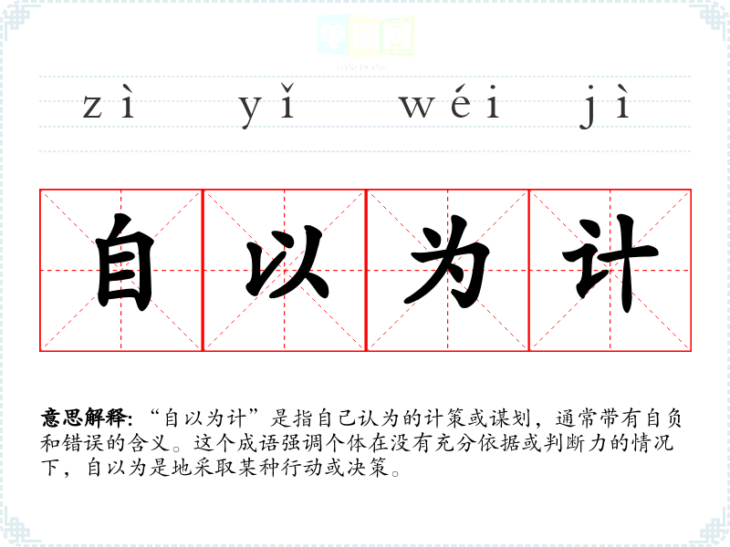成语“自以为计”并没有明确的历史典故或文学出处,但其构成部分的意义可以追溯到古代文献中对“自以为”的描述,表达了一个人过于自信且缺乏自我反省的状态。在古代文化中,自以为是的行为常常被视为愚蠢和短视。