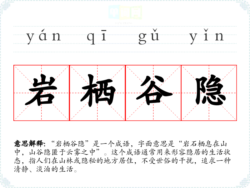 “岩栖谷隐”是一个成语,字面意思是“岩石栖息在山中,山谷隐匿于云雾之中”。这个成语通常用来形容隐居的生活状态,指人们在山林或隐秘的地方居住,不受世俗的干扰,追求一种清静、淡泊的生活。