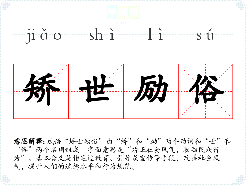 成语“矫世励俗”由“矫”和“励”两个动词和“世”和“俗”两个名词组成。字面意思是“矫正社会风气,激励民众行为”。基本含义是指通过教育、引导或宣传等手段,改善社会风气,提升人们的道德水平和行为规范。