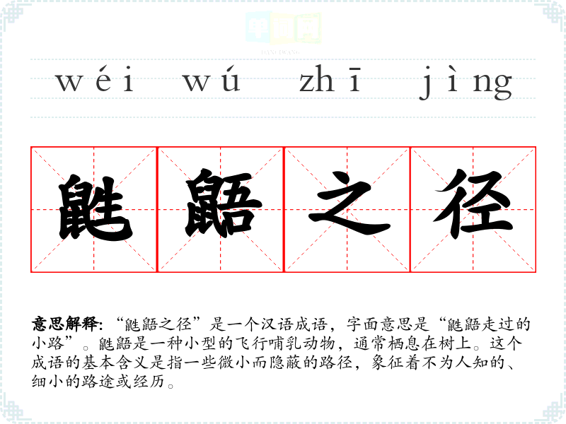 “鼪鼯之径”是一个汉语成语,字面意思是“鼪鼯走过的小路”。鼪鼯是一种小型的飞行哺乳动物,通常栖息在树上。这个成语的基本含义是指一些微小而隐蔽的路径,象征着不为人知的、细小的路途或经历。