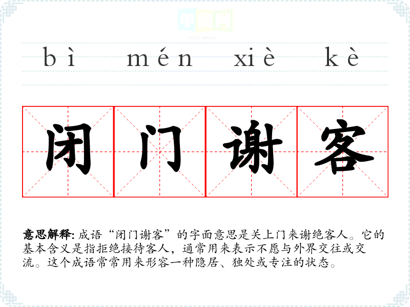 成语“闭门谢客”的字面意思是关上门来谢绝客人。它的基本含义是指拒绝接待客人,通常用来表示不愿与外界交往或交流。这个成语常常用来形容一种隐居、独处或专注的状态。