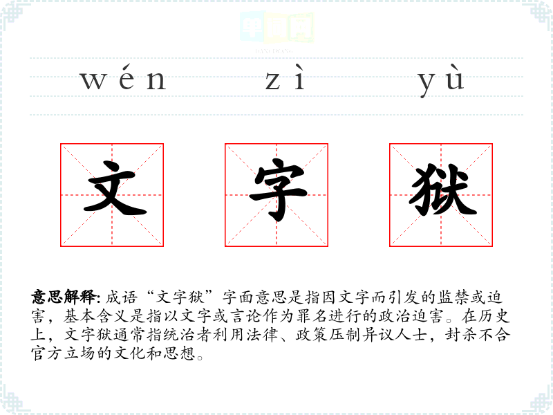 成语“文字狱”字面意思是指因文字而引发的监禁或迫害,基本含义是指以文字或言论作为罪名进行的政治迫害。在历史上,文字狱通常指统治者利用法律、政策压制异议人士,封杀不合官方立场的文化和思想。