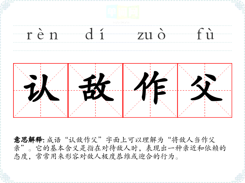 成语“认敌作父”字面上可以理解为“将敌人当作父亲”。它的基本含义是指在对待敌人时,表现出一种亲近和依赖的态度,常常用来形容对敌人极度恭维或迎合的行为。