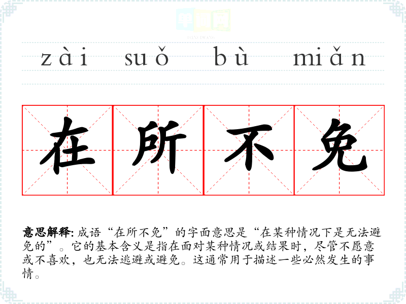 成语“在所不免”的字面意思是“在某种情况下是无法避免的”。它的基本含义是指在面对某种情况或结果时,尽管不愿意或不喜欢,也无法逃避或避免。这通常用于描述一些必然发生的事情。