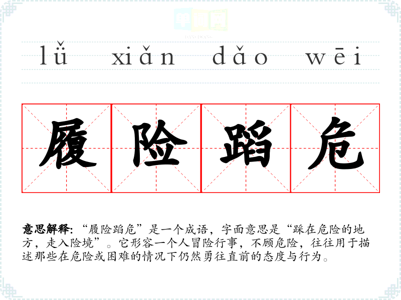 “履险蹈危”是一个成语,字面意思是“踩在危险的地方,走入险境”。它形容一个人冒险行事,不顾危险,往往用于描述那些在危险或困难的情况下仍然勇往直前的态度与行为。
