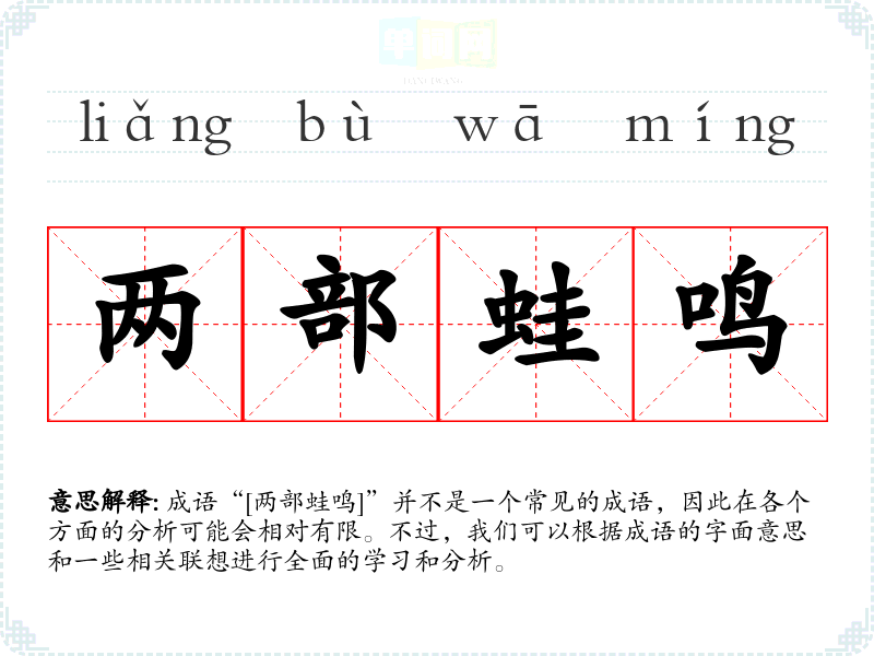 成语“[两部蛙鸣]”并不是一个常见的成语,因此在各个方面的分析可能会相对有限。不过,我们可以根据成语的字面意思和一些相关联想进行全面的学*和分析。