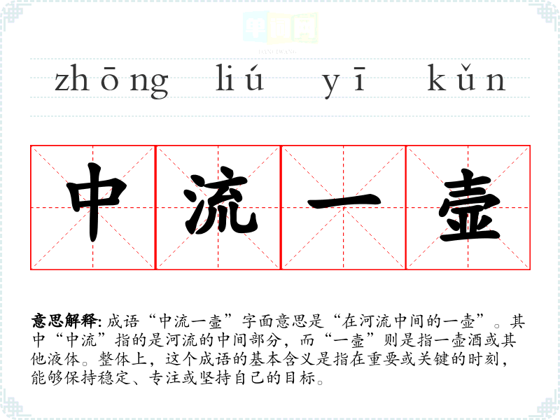 成语“中流一壸”字面意思是“在河流中间的一壶”。其中“中流”指的是河流的中间部分,而“一壸”则是指一壶酒或其他液体。整体上,这个成语的基本含义是指在重要或关键的时刻,能够保持稳定、专注或坚持自己的目标。