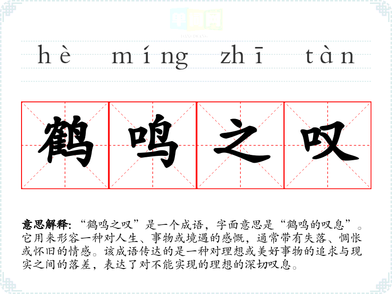 “鹤鸣之叹”是一个成语,字面意思是“鹤鸣的叹息”。它用来形容一种对人生、事物或境遇的感慨,通常带有失落、惆怅或怀旧的情感。该成语传达的是一种对理想或美好事物的追求与现实之间的落差,表达了对不能实现的理想的深切叹息。