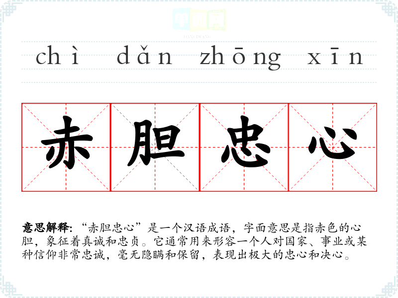 - 日常对话:在朋友或同事之间,可以用来形容某人对某事的忠诚,比如“你真是赤胆忠心,愿意为了这个项目付出这么多。”