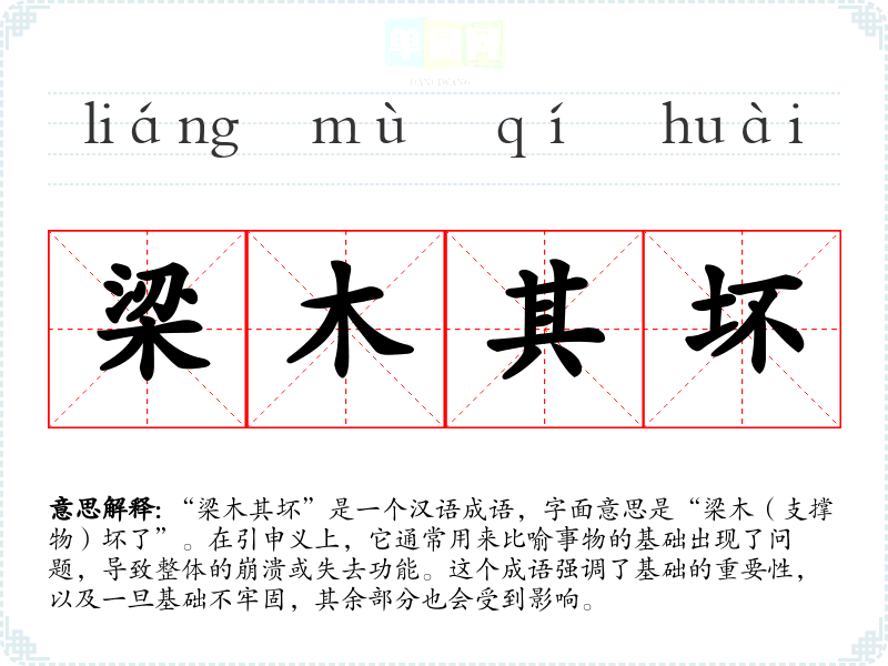 “梁木其坏”出自《左传》,原文是:“梁木其坏,何以为栋?”意思是说,梁木坏了,怎么能作为支撑的栋梁?这是在论述一个国家或组织的基础(如德行、法治等)如果出现问题,整个平台就会动摇。