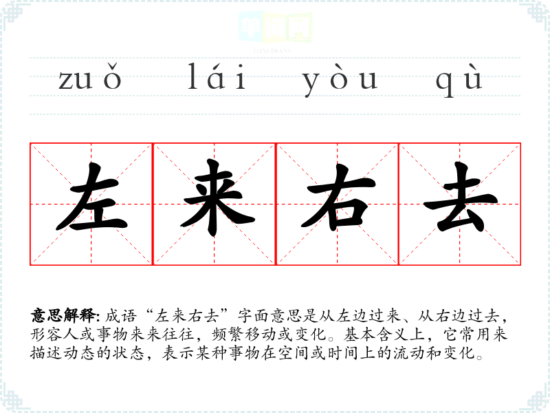 成语“左来右去”字面意思是从左边过来、从右边过去,形容人或事物来来往往,频繁移动或变化。基本含义上,它常用来描述动态的状态,表示某种事物在空间或时间上的流动和变化。
