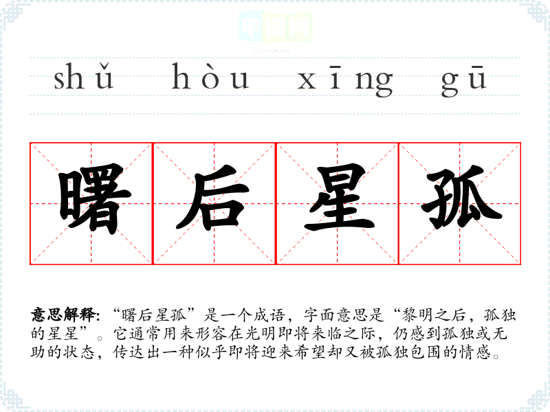 “曙后星孤”是一个成语,字面意思是“黎明之后,孤独的星星”。它通常用来形容在光明即将来临之际,仍感到孤独或无助的状态,传达出一种似乎即将迎来希望却又被孤独包围的情感。