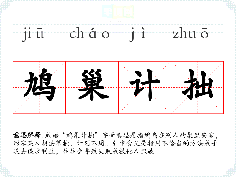 成语“鸠巢计拙”字面意思是指鸠鸟在别人的巢里安家,形容某人想法笨拙,计划不周。引申含义是指用不恰当的方法或手段去谋求利益,往往会导致失败或被他人识破。