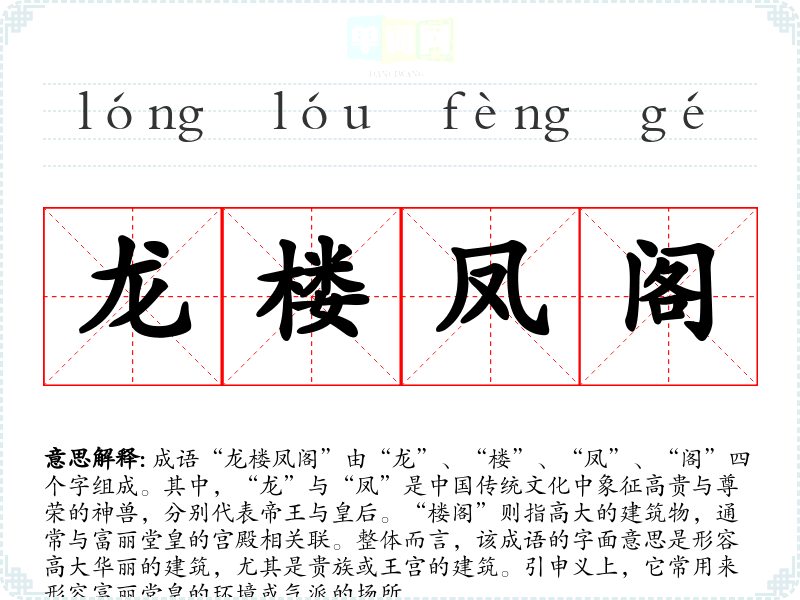 成语“龙楼凤阁”由“龙”、“楼”、“凤”、“阁”四个字组成。其中,“龙”与“凤”是**传统文化中象征高贵与尊荣的神兽,分别代表帝王与皇后。“楼阁”则指高大的建筑物,通常与富丽堂皇的宫殿相关联。整体而言,该成语的字面意思是形容高大华丽的建筑,尤其是贵族或王宫的建筑。引申义上,它常用来形容富丽堂皇的环境或气派的场所。
