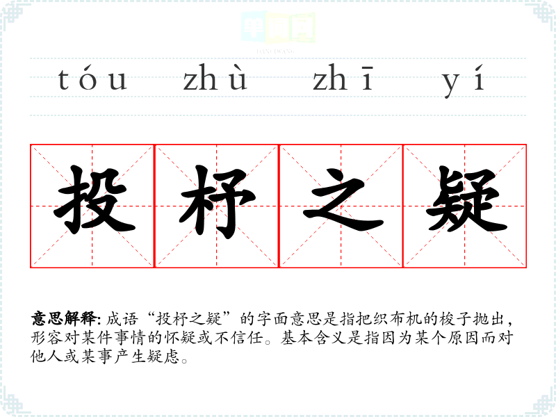 成语“投杼之疑”的字面意思是指把织布机的梭子抛出,形容对某件事情的怀疑或不信任。基本含义是指因为某个原因而对他人或某事产生疑虑。
