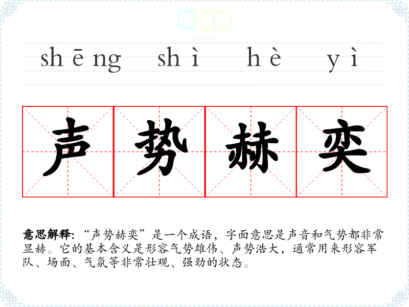 “声势赫奕”是一个成语,字面意思是声音和气势都非常显赫。它的基本含义是形容气势雄伟、声势浩大,通常用来形容军队、场面、气氛等非常壮观、强劲的状态。